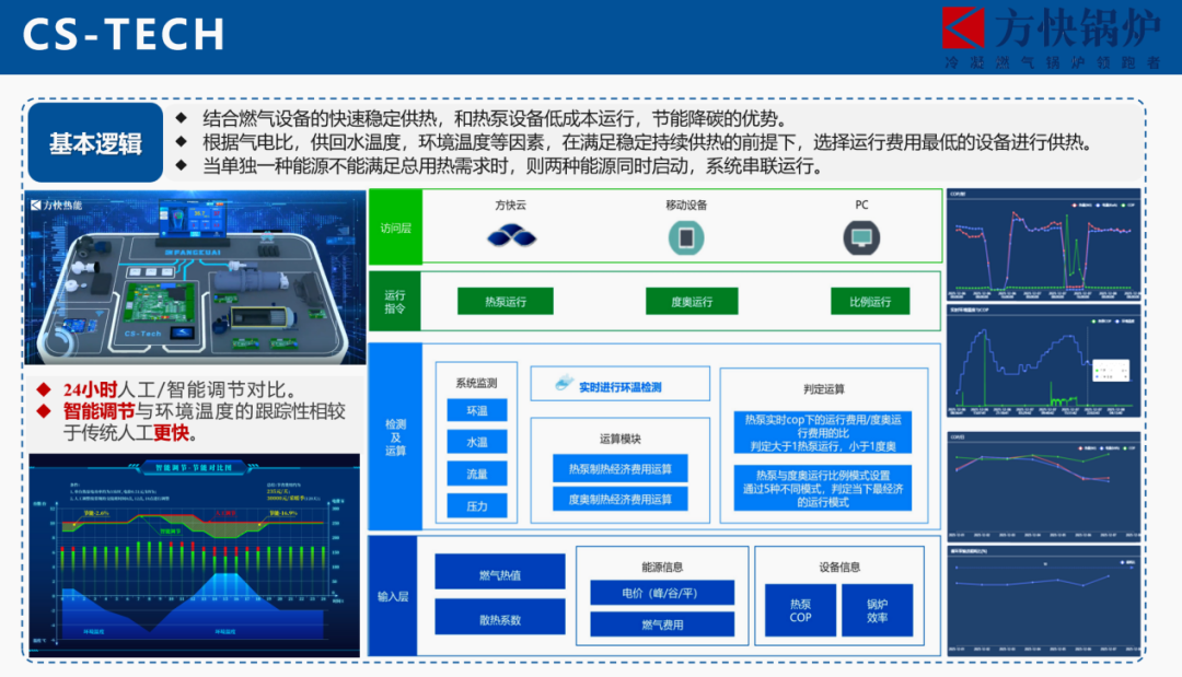 方快锅炉自主研发的“5G+锅炉云”平台和CS-TECH多能源耦合控制系统正是这一领域的集大成者。据卢总监介绍,CS-TECH系统的核心能力在于“融合”与“决策”。它能够将空气源热泵、废水源热泵、电极锅炉、燃气锅炉、烟气源热泵等多种制热设备,有机地融合在一个系统中;平台利用5G技术的特性,实时采集海量运行数据。其核心在于内置的智能优化算法,这套算法是方快团队基于大量运行经验与数据模型开发而成。它能根据环境温度、用户负荷、实时电价等多维度变量,自动寻优并动态调节设备参数。这意味着,系统能在精准满足用户舒适度的前提下,自动避开用电高峰、利用低价谷电,并始终保持设备在最佳热效率区间运行。这种由算法驱动的自动化管理,彻底摆脱了对人工经验的依赖,将能源利用效率的优化推向了极致,是方快在智慧能源管理领域的一次重要技术跨越。